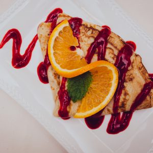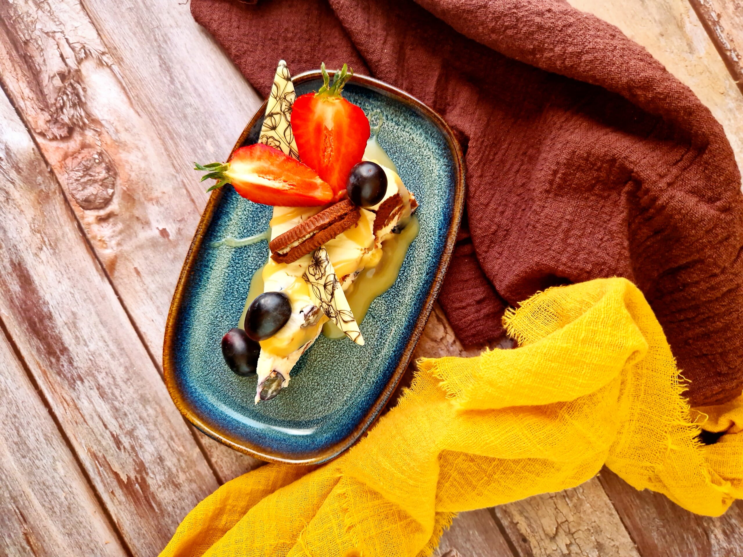 Domino- toorjuustukook mustikate ja valge šokolaadiga, serveeritud soolakaramelliga.