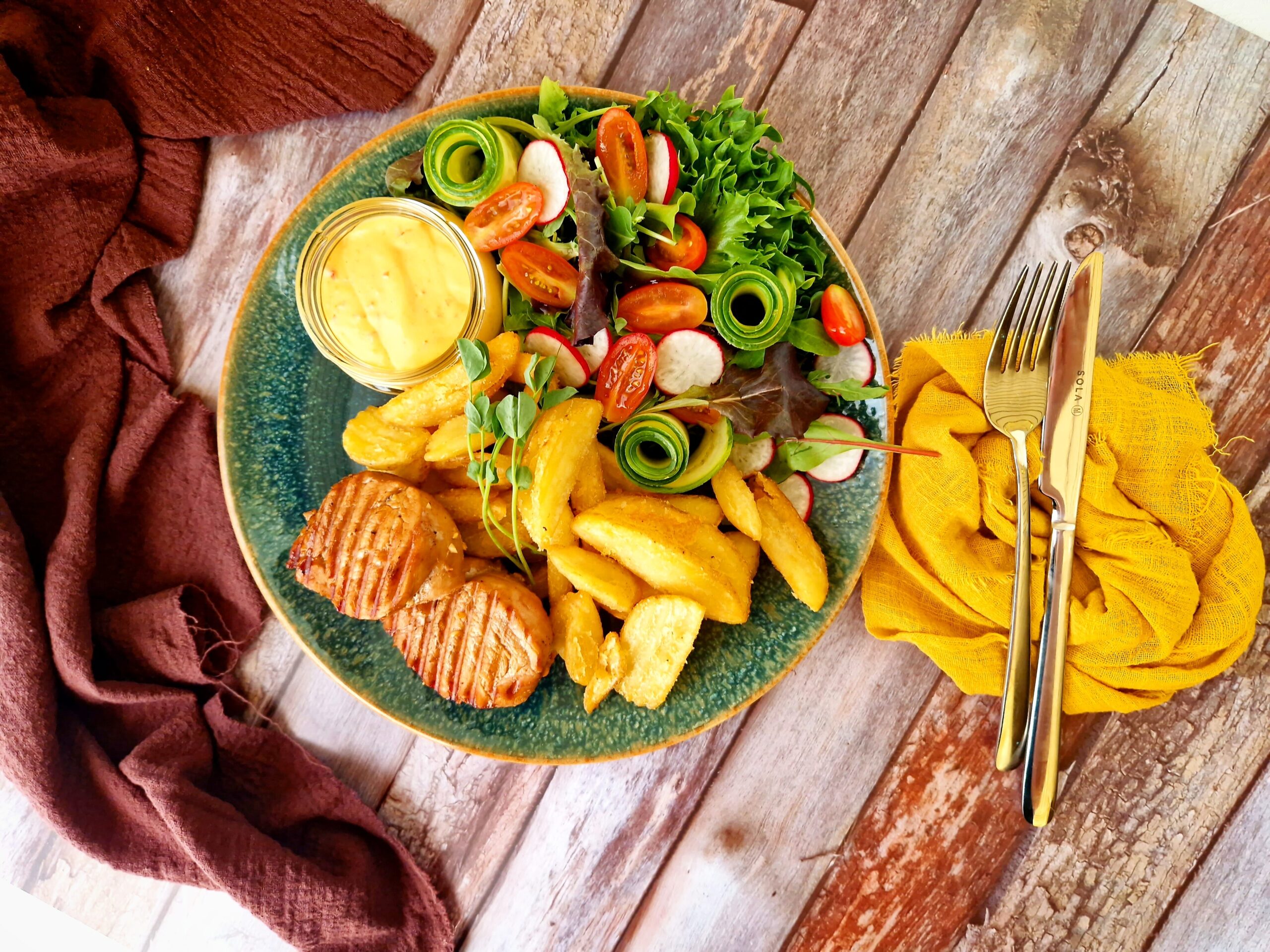 Viskimarinaadis seasisefilee, hooajaliste köögiviljade salat, tšillimajo, lisand valikust.