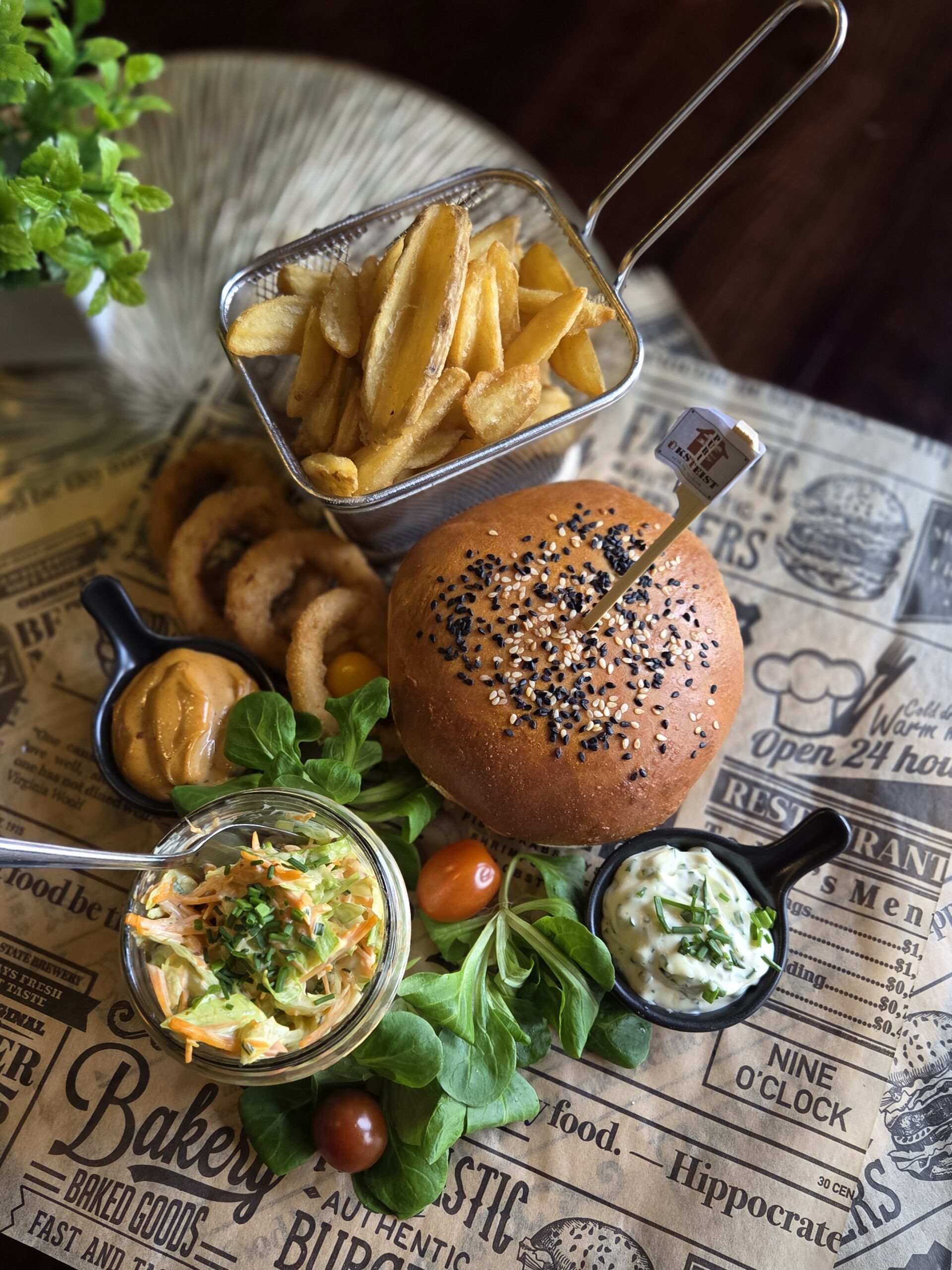 Burger, sibularõngad, crispers kartulid, coleslaw salat, dippide valik