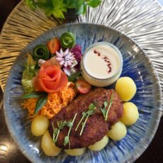 Sea sisefilee, sinihallitusjuust, kooresed küüslaugu pannikartulid, marineeritud paprika