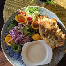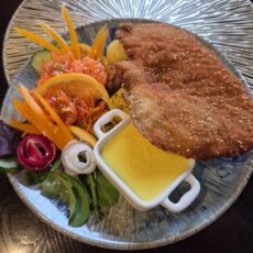 Kanafilee riivsaia ja parmesani paneeringus, värske salat, koorekaste, lisand valikust