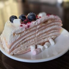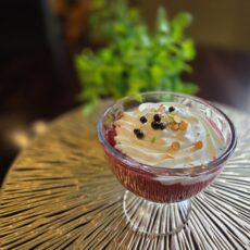 Domino- toorjuustukook mustikate ja valge šokolaadiga, serveeritud soolakaramelliga.