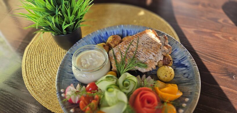 Karbonaad lisandiks ürdikartul , koorekaste ja värske salati buffee Taimetoit: Taimsed pelmeenid vürtsikate köögiviljadega lisandiks vegan majoneesiga ürdikaste ja värske salati buffee