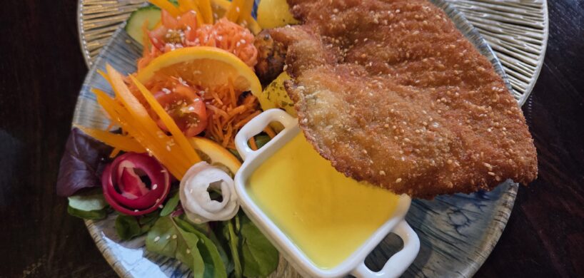 Kana seesami šnitsel lisandiks riis või ahjukartul , koorekaste ja värske salati buffee