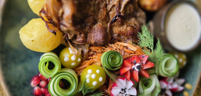 Õlle ja sibula marinaadis kaelakarbonaad lisandiks ahjukartul või tatar, kaste ja värske salati buffee Taimetoit: Vegan pelmeenid vürtsikate köögiviljadega, sweet chilli kaste ja värske salati buffee